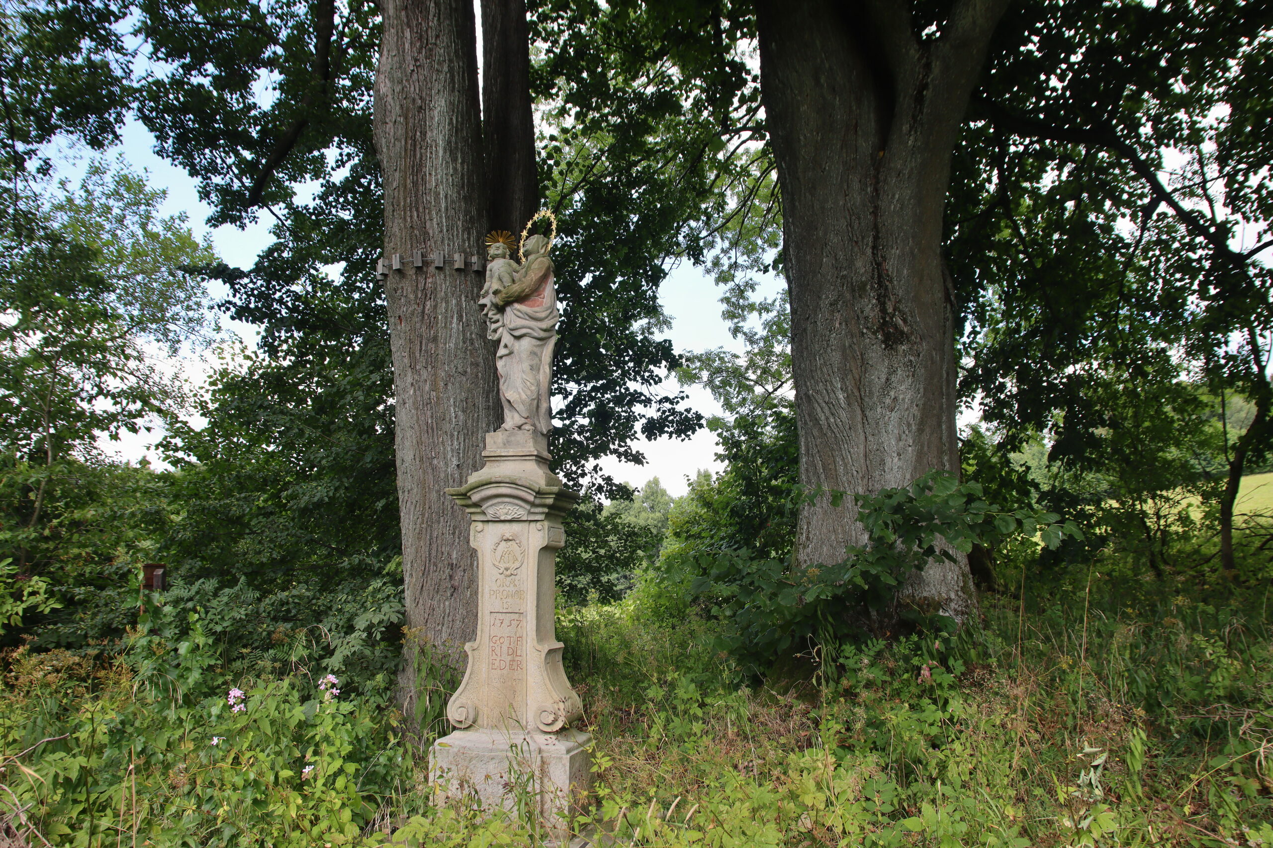 Až se pokocháte obnoveným křížem, pokračujte dále směrem na Říčky k prvnímu stavení části obce Horní Rybná, kde odbočuje neznačená cesta vpravo. Po asi půl kilometru narazíte na samostatně stojící dům, v jehož těsné blízkosti pod starými lipami najdete sochu Panny Marie s dítětem, která prošla obnovou už v roce 2022.