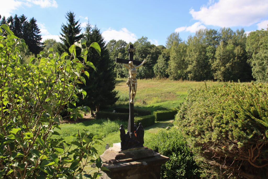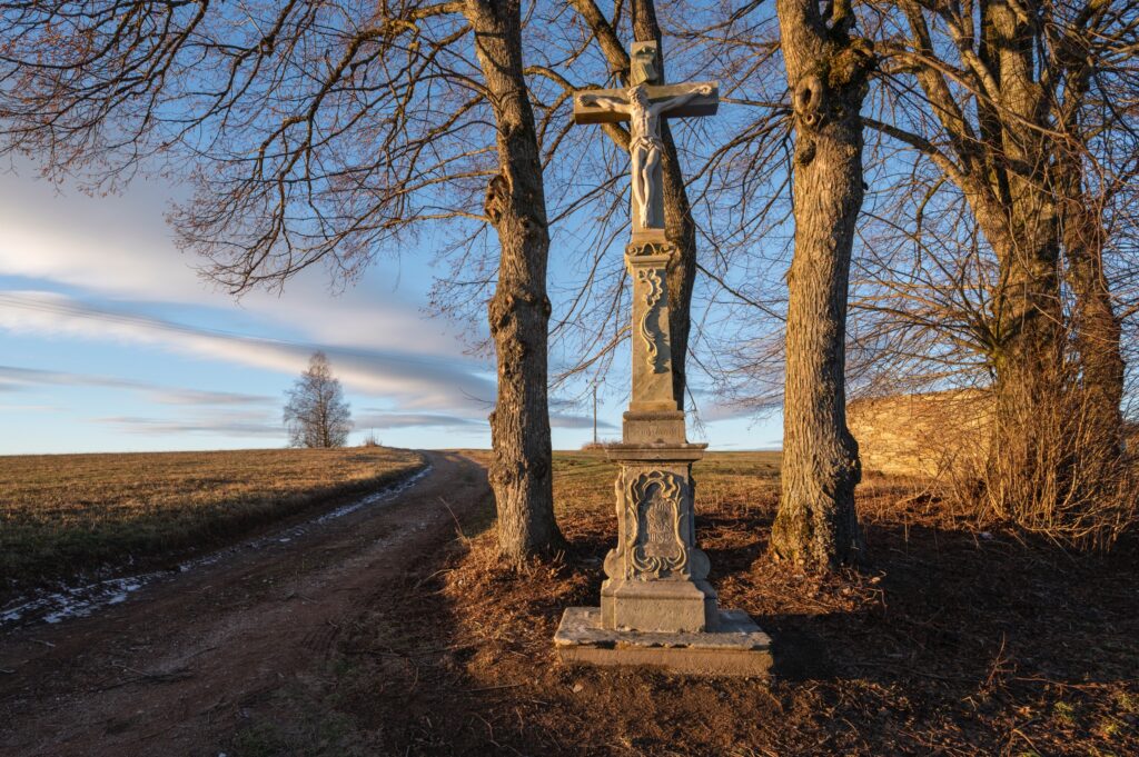 Právě v blízkosti kostela a hřbitova je možné zaparkovat a vyrazit na pěší výlet. Trasu výletu si můžete otevřít na stránkách Mapy.cz. Nejprve se vydejte po silničce směrem na Říčky v Orlických horách. Na rozcestí u posledních chalup Nebeské Rybné najdete nově opravený kamenný kříž.